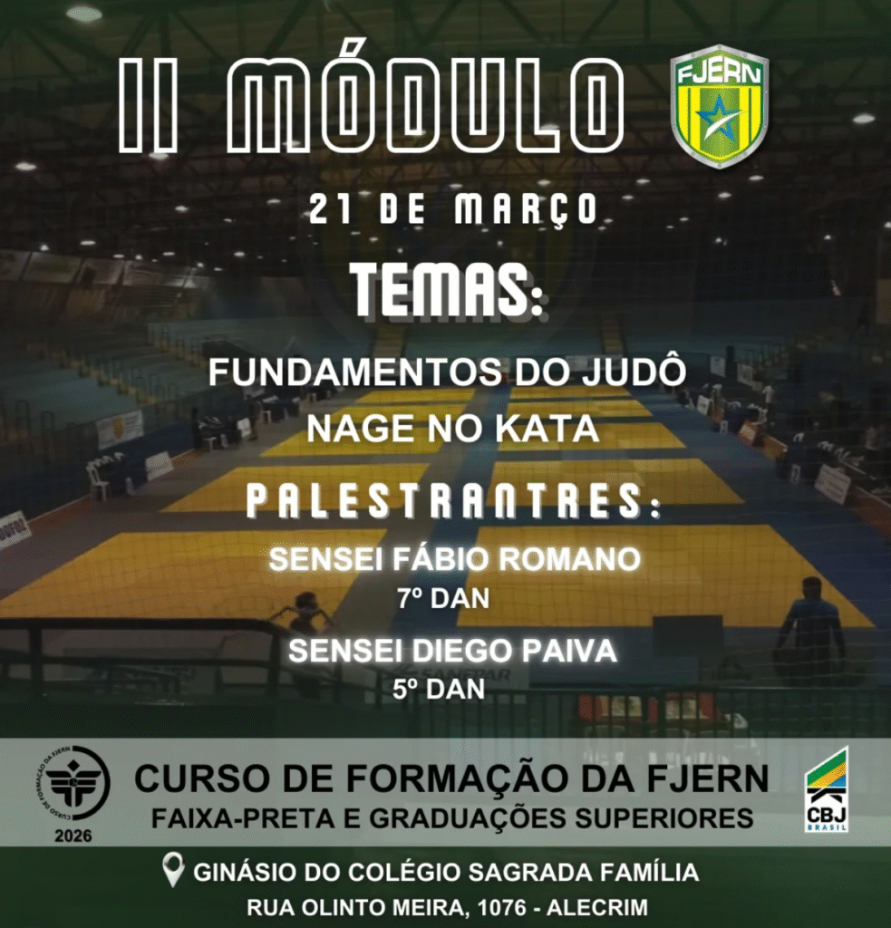 A Federação de Judô do Estado do Rio Grande do Norte (FJERN) realiza neste sábado (21) o II Módulo do Curso de Formação de Faixa-Preta e Graduações Superiores 2026, no Ginásio do Colégio Sagrada Família, localizado na Rua Olinto Meira, 1076, bairro Alecrim, em Natal.